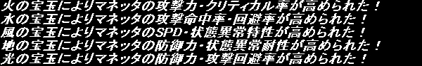 宝玉によって増強される能力に差異があり、上がる能力はそれぞれ以下のようになっています。